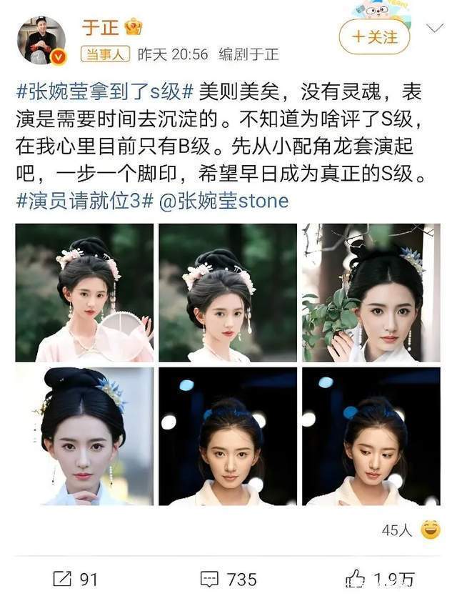 却原来是老板厉害,给节目组发长信保驾护航。一时间网络上的质疑声连绵不绝。似乎是意识到舆论的发展不受控制,于正立即发文评价张婉莹的表演是“美则美矣,没有灵魂。表演是需要时间去沉淀的。”同时,他也表示自己并不认可节目组给出的S评级,认为张婉莹的实力在他自己眼里也就是B级的水平。一番言论虽短,却言辞恳切,也表达了于正对于自己新签女演员的爱护和鼓励。