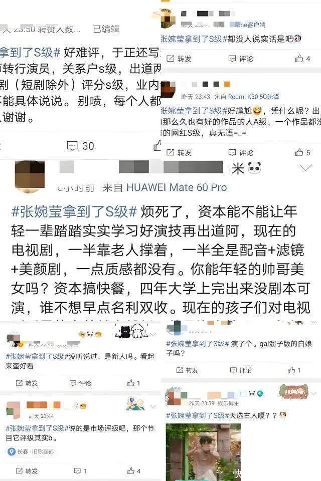 网友的评论自然不太好听。在大多数观众看来,张婉莹长得很漂亮,一眼就能够攫取观众的目光。不得不承认于正挑选演员的眼光还蛮毒辣的。而张婉莹本人虽然签约了业内的好公司,日后也不缺影视剧资源和公众曝光度,但她并没有躺平。而是尽早的以演员的身份投入工作,参加演技竞技综艺只是第一步。但这个评级确实虚高了。部分观众原以为是自己低估了张婉莹,S评级是人家有真本事,演技和灵气好到是老天爷赏饭吃的程度。