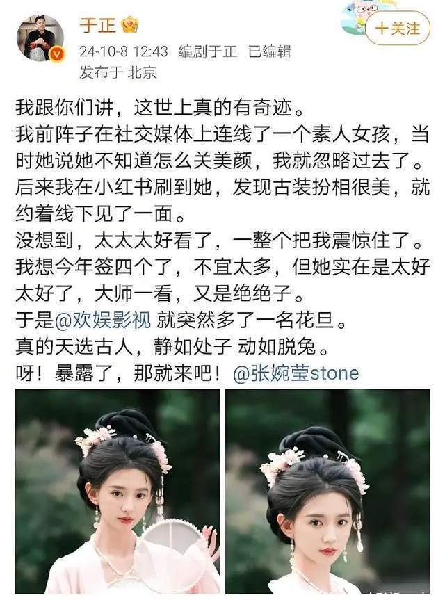 作为网络冲浪达人,于正向内娱输送新鲜血液是认真的。张婉莹就是于正最新签约的代表艺人之一,她的外形条件很优越,是名副其实的美人。难得的是,张婉莹前面的一份工作还是高校思政老师,气质极好。在“九漏鱼遍布”的娱乐圈,经过知识熏陶的高智女演员算是一股清流,“腹有诗书气自华”用来形容她正巧合适。或许也是因为这样,张婉莹对于如何走演员道路很有主见。
